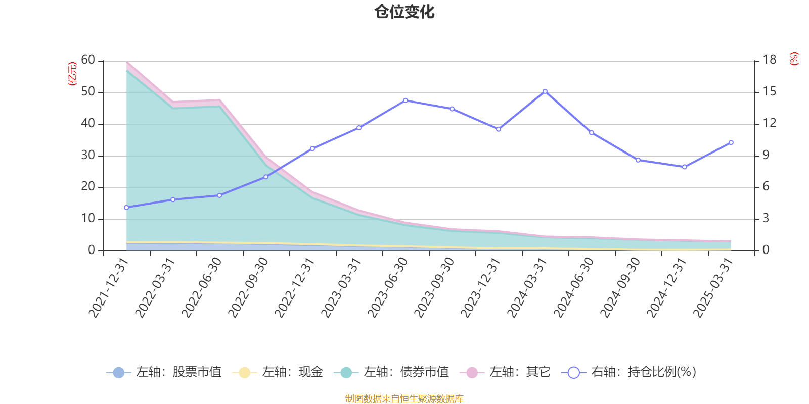 据定期报告数据统计,近三年平均股票仓位为10.48%,同类平均为18.87%。2024年一季度末基金达到15.09%的最高仓位,2021年末最低,为4.1%。