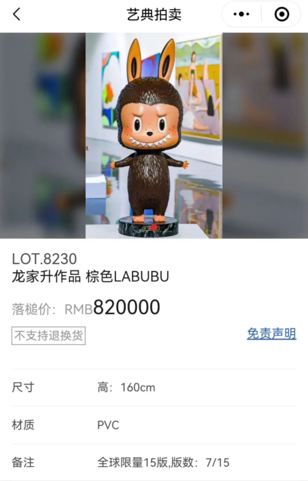 6月10日,在永乐2025春季拍卖会上,一款显示为初代藏品级薄荷色的LABUBU最终以108万元的天价完成竞拍。据了解,此次拍卖出现在全球首场初代藏品级LABUBU艺术专场。该款LABUBU尺寸为高131cm,材质为PVC,颜色为薄荷色,在备注栏标注了“全球唯一一只”。除此之外,一款全球限量15版棕色LABUBU以82万元成交。