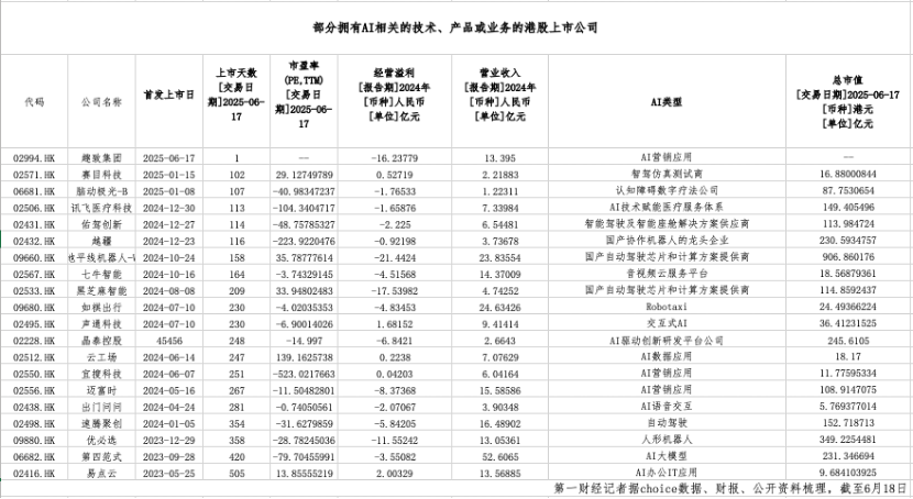 从市场表现看,这批AI上市公司整体表现亮眼。截至6月17日,地平线机器人-W(09660.HK)以906.86亿港元市值领跑,优必选(09880.HK)、晶泰控股分别以349.23亿港元和245.61亿港元紧随其后。
